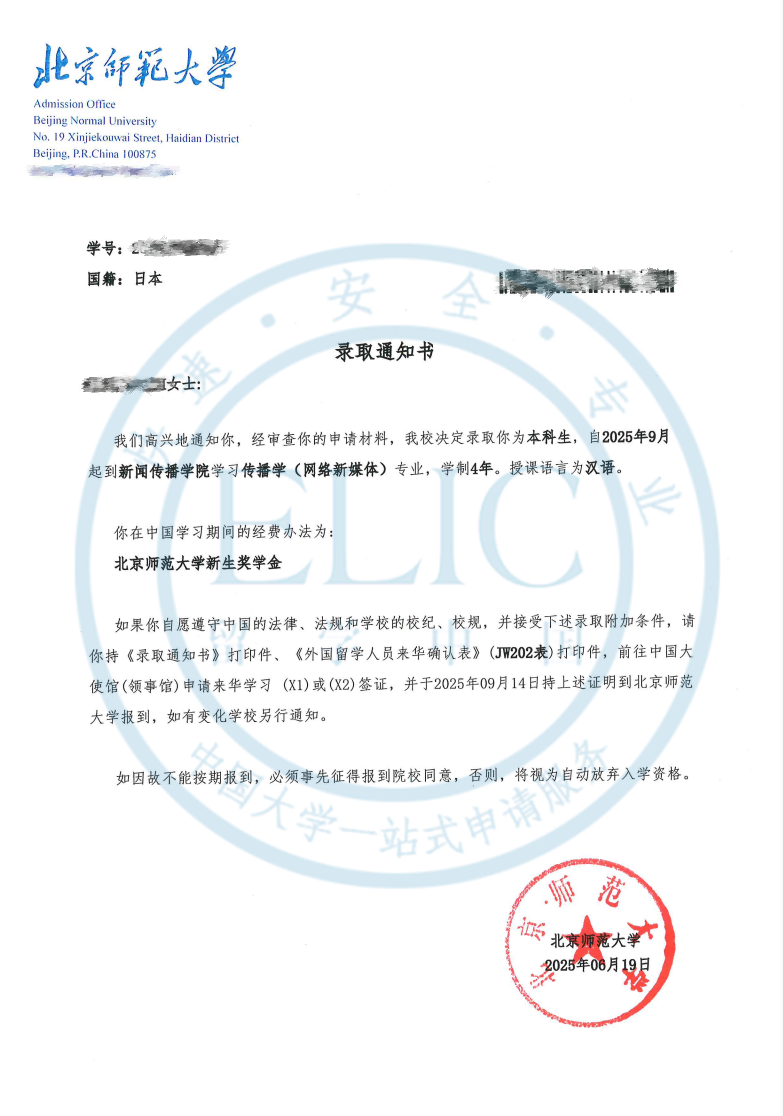 恭喜我们的日本学生成功获得北京师范大学传播学专业本科奖学金录取!