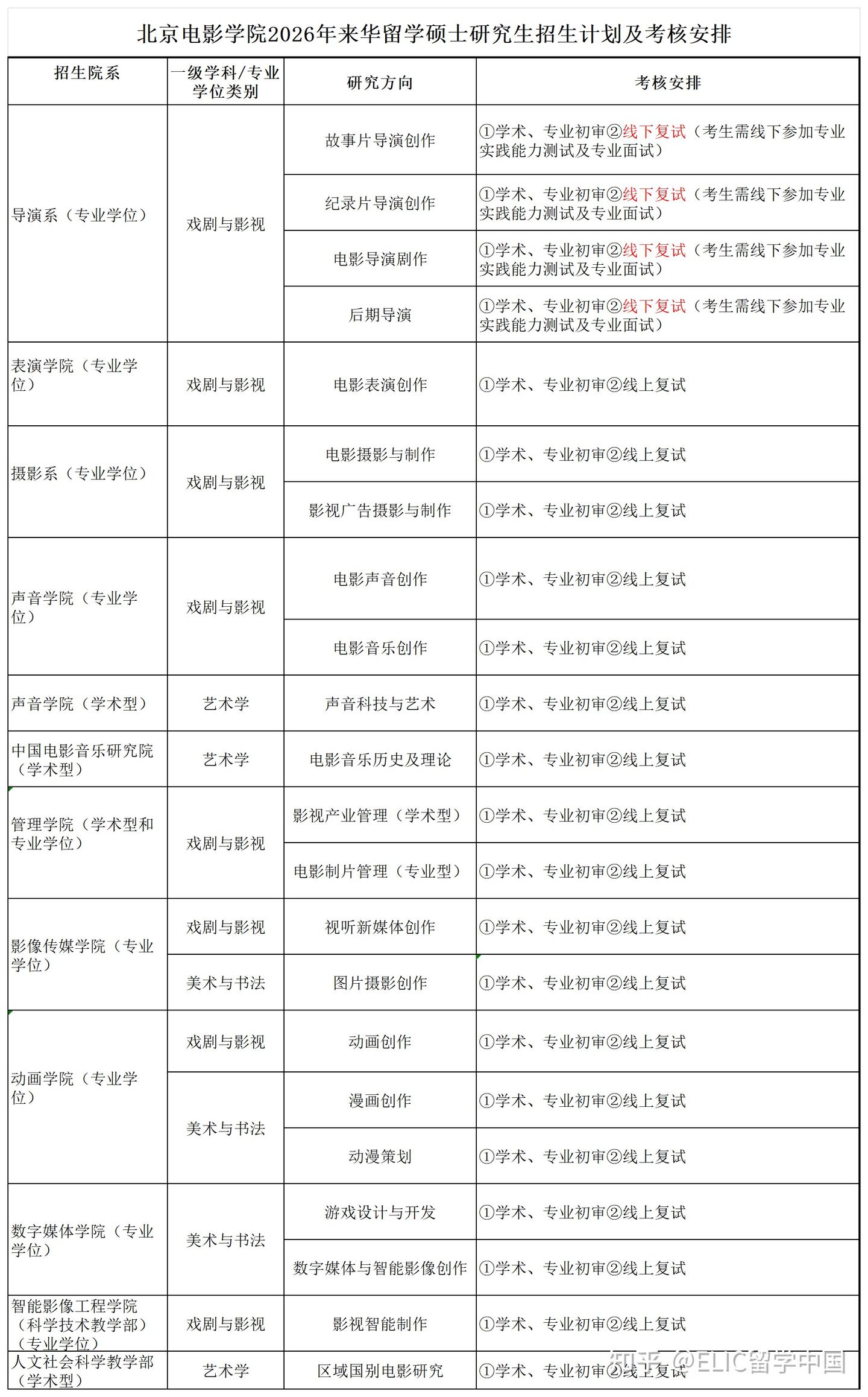 入学考核分为材料初审和面试复试两部分。申请导演系的考生需要来校参加线下面试,其它院系申请者均参加线上面试。