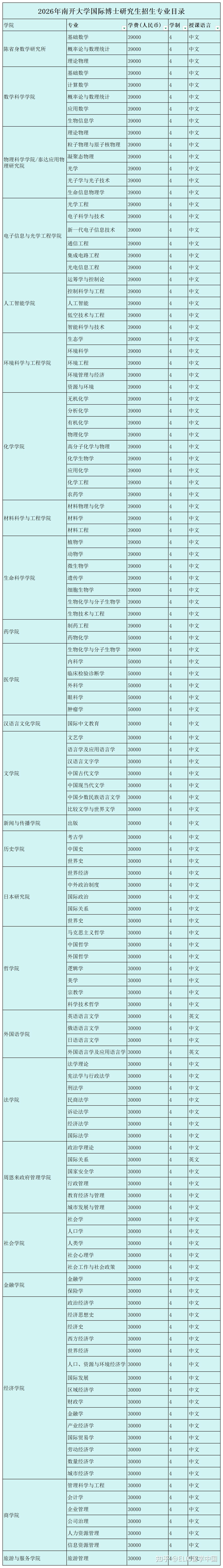 2026年南开大学有127个博士专业面向国际学生进行招生,其中有3个专业可提供英文授课项目,基础学制为4年。完成规定的教学计划、考核合格并通过毕业论文答辩者,颁发博士研究生毕业证书;经学位审查合格者,授予博士研究生学位。此外,所有中文授课博士研究生须于毕业前通过国家汉语水平考试(HSK)五级,对于汉语言文化学院和文学院的博士研究生,须通过国家汉语水平考试(HSK)六级且成绩在180分以上。英文授课的博士研究生可不提供汉语水平考试成绩证明。