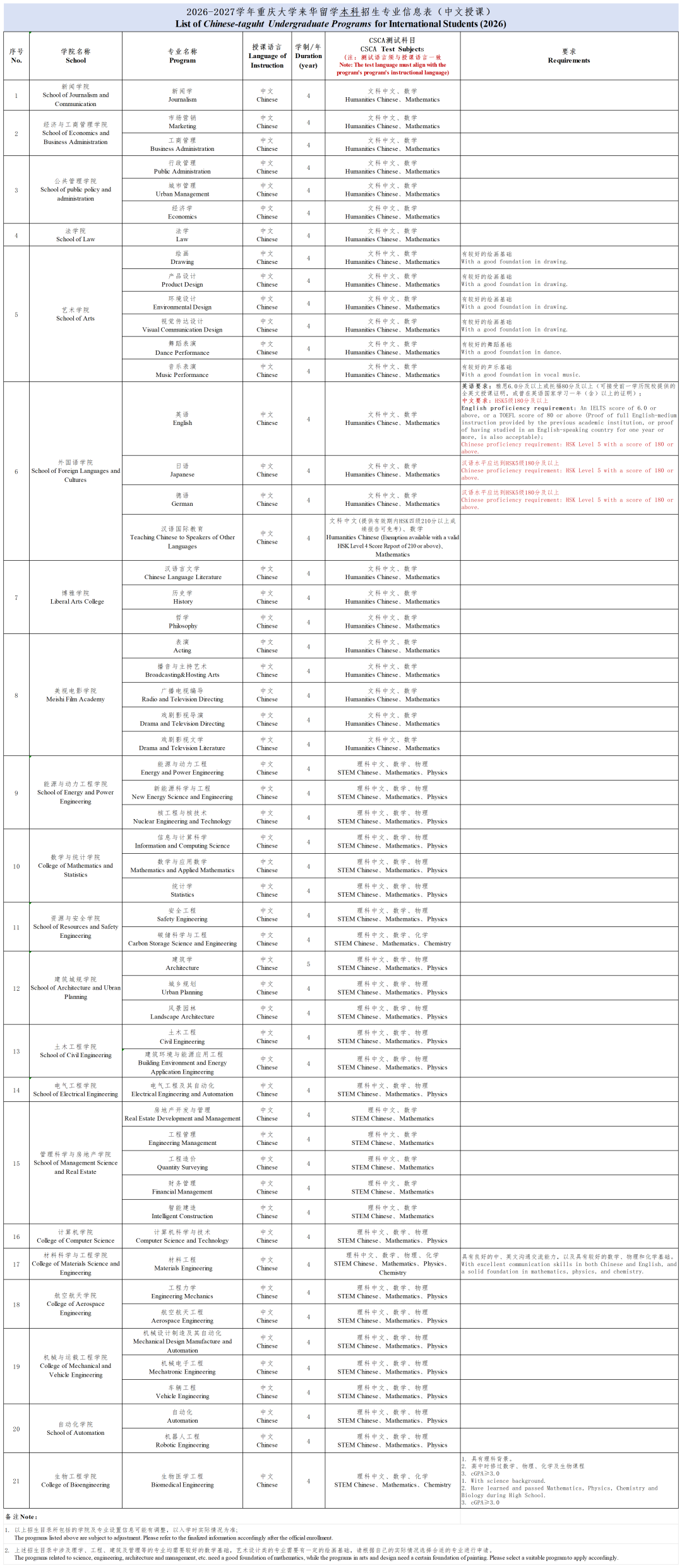 所有申请我校本科学历教育的申请人均须参加由中国教育部国家留学基金管理委员会组织的“来华留学本科入学学业水平测试(CSCA)”,并在申请时提交有效成绩单。