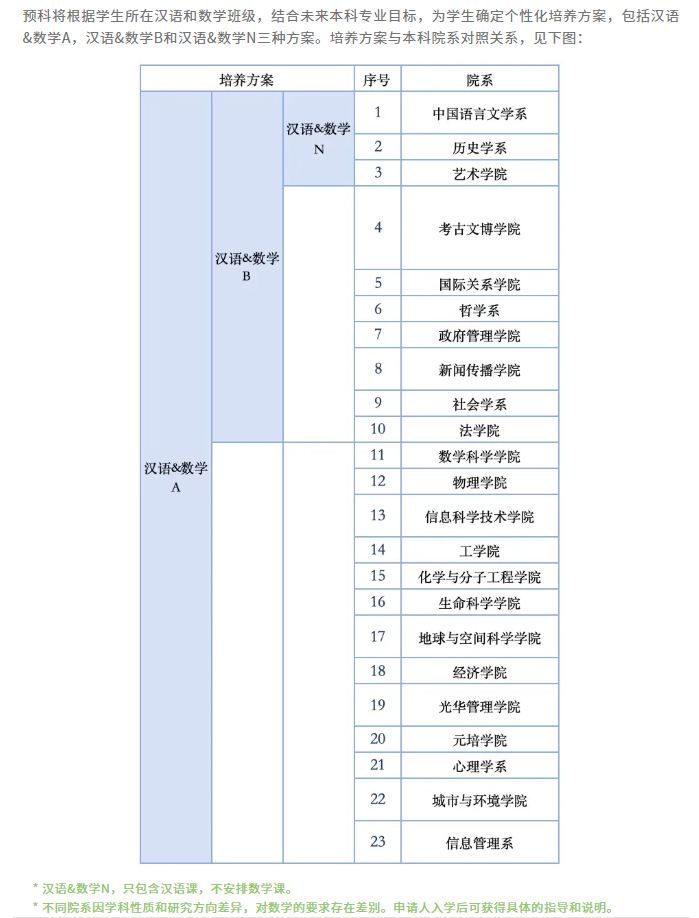 预科在入学后举行数学分班考试,根据学生自身数学水平、汉语水平和未来就读本科专业目标,为学生确定数学班级,一般分为基础班(数学B)和高级班(数学A)。