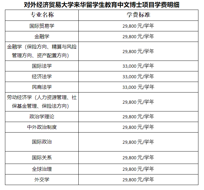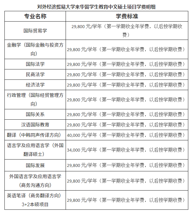 对外经济贸易大学留学生公寓专门用来接待来我校学习进修的长、短期外国留学生的住宿,即汇宾公寓、汇德公寓、国际交流大厦三幢留学生公寓楼,共有高、中、低档房间1000余间,床位2000余张,费用标准:三个月以上的价格为:50-85元/床;三个月以下的价格为:100-170元/床。
