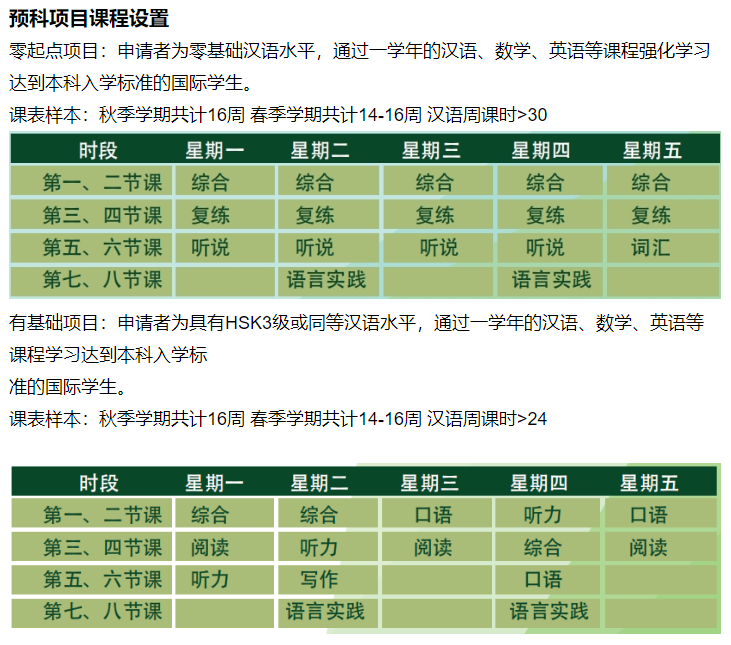 根据对外经济贸易大学的学科特色和专业要求,开设商科类衔接专业汉语课,并在春季学期开设数学和英语课程。