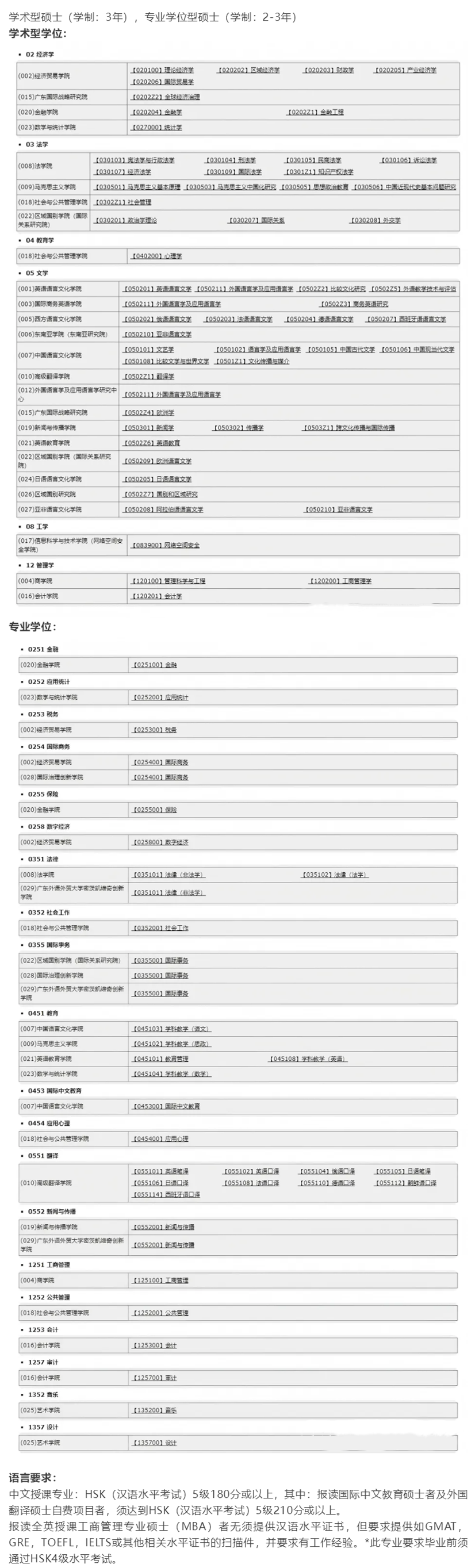 1、中文授课本科(中外学生共同学习):英语、国际商务、商务英语、法语、德语、西班牙语、俄语、葡萄牙语、日语、朝鲜语、阿拉伯语、印地语、乌尔都语、波斯语、孟加拉语、土耳其语、希伯来语、斯瓦西里语、汉语言、汉语国际教育、翻译、国际经济与贸易、财政学、税收学、数字经济、经济学、工商管理、市场营销、人力资源管理、电子商务、供应链管理、大数据管理与应用、大数据管理与应用、会计学、财务管理、审计学、金融学大类、法学、政治学类、教育学、计算机科学与技术、软件工程、网络空间安全、应用心理学、社会工作、行政管理、新闻学、播音与主持、网络与新媒体、音乐表演、舞蹈表演、视觉传达设计、应用数学、统计学
