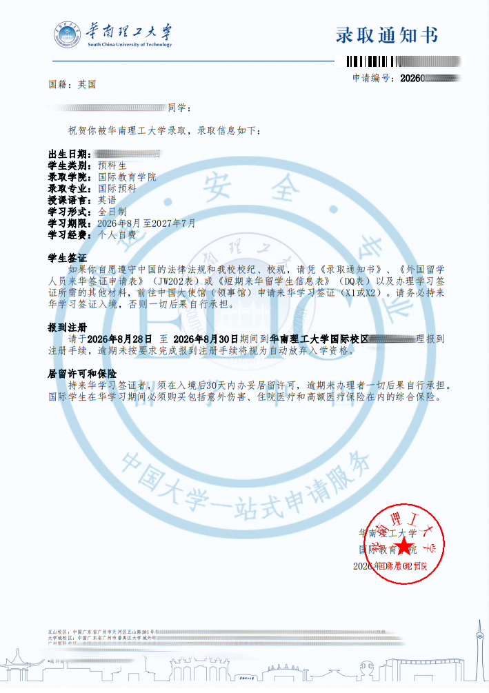 恭喜ELIC的英国籍学生被华南理工大学预科录取!