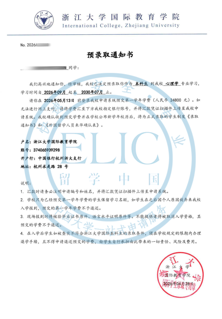 恭喜我们的韩国籍学生浙江大学心理学本科预录取!!!